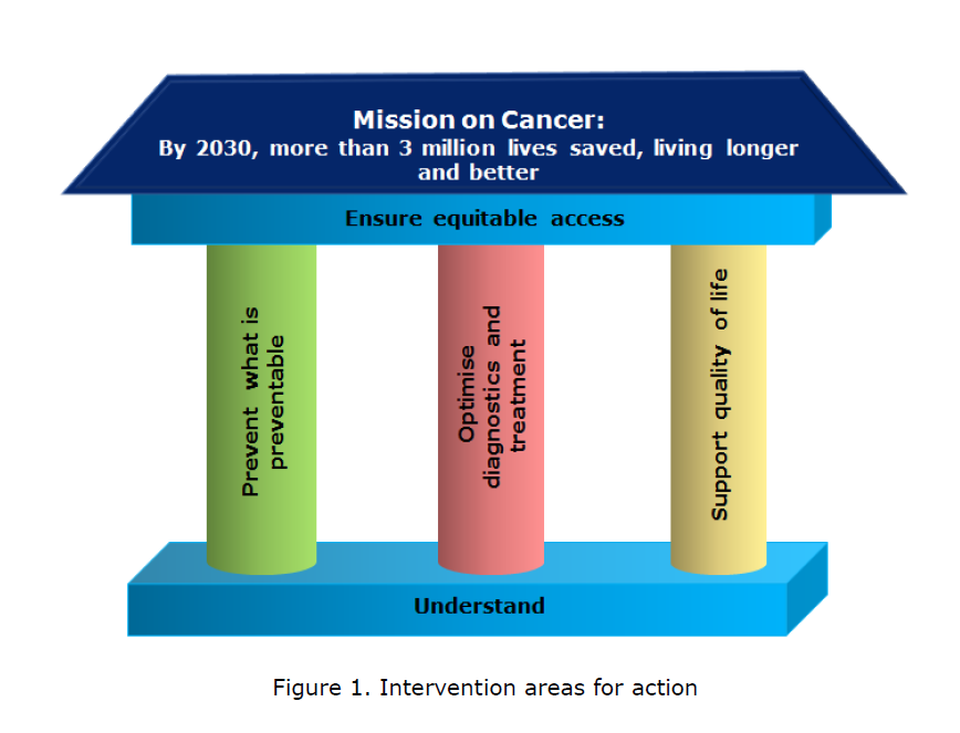 El esbozo de la misión con el aporte de los ciudadanos, los pacientes y las partes interesadas de los Estados miembros, presenta ahora 13 recomendaciones de acciones (2 por cada uno de los 5 pilares y 3 transversales) para comprender el cáncer, sus factores de riesgo y su impacto; para prevenir lo que se puede prevenir; optimizar el diagnóstico y el tratamiento; y apoyar la calidad de vida de las personas que viven con y después del cáncer, garantizando al mismo tiempo un acceso equitativo para todos.