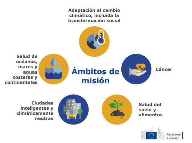 Teniendo en cuenta estas características, en el reglamento de Horizonte Europa se acordaron (de momento) cinco ámbitos principales , dentro de los cuales se definen las misiones:
