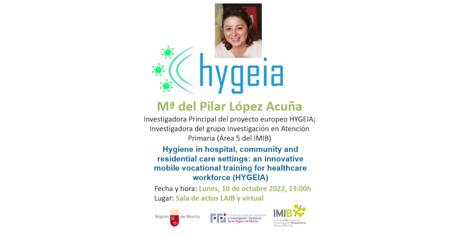 El próximo día 10 de octubre 2022 tendremos el placer de acoger en el seminario del IMIB a la Dra. María del Pilar López Acuña, del grupo de investigación en epidemiología, salud pública y servicios de salud, área 5 del IMIB que compartirá con nosotros su experiencia de participación en el proyecto Europeo Erasmus Plus (HYGEIA) - Higiene en entornos de Atención Hospitalaria, comunitaria y Residencial: Una Formación Profesional Móvil Innovadora para el personal Sanitario.