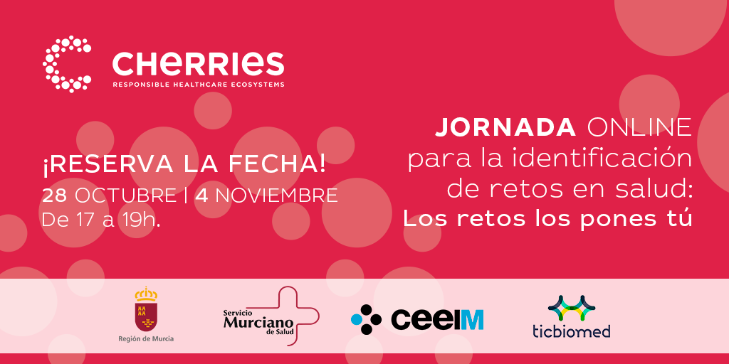 Los socios del Proyecto CHERRIES en la Región de Murcia: Servicio Murciano de Salud, Dirección General de Unión Europea – Región de Murcia, Ticbiomed y CEEIM, tienen el placer de invitarle a la reunión virtual informativa que tendrá lugar el próximo miércoles 28 de octubre 17h-19h en formato online a modo de seminario web (webinar). Dicha reunión está dirigida a Asociaciones de pacientes, familiares o cuidadores, Ayuntamientos, Universidades (investigadores) y profesionales del SMS.
