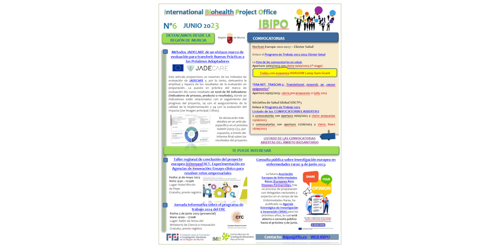 Volvemos con las actualizaciones del ámbito internacional. En el boletín informativo de la IBiPO de este mes destacamos los avances de la Acción Conjunta europea JADECARE, en el que participa el personal investigador del Sistema Regional de Salud (SMS / FFIS – IMIB).