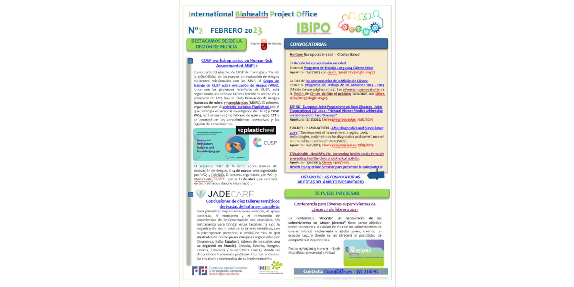 • El Grupo de trabajo de CUSP sobre evaluación de riesgos (WG5), junto con los proyectos miembros de CUSP, está organizando una serie de talleres temáticos on-line en la primavera de 2023 bajo el título Evaluación de riesgos humanos de micro y nanoplásticos (MNPL). El primero, organizado por el proyecto europeo PlasticHeal (en el que participa el personal investigador del IMIB) y CUSP WG5, será el martes 7 de febrero de 9:00 a 14:00 CET y se centrará en los conocimientos normativos y las lagunas de conocimiento.