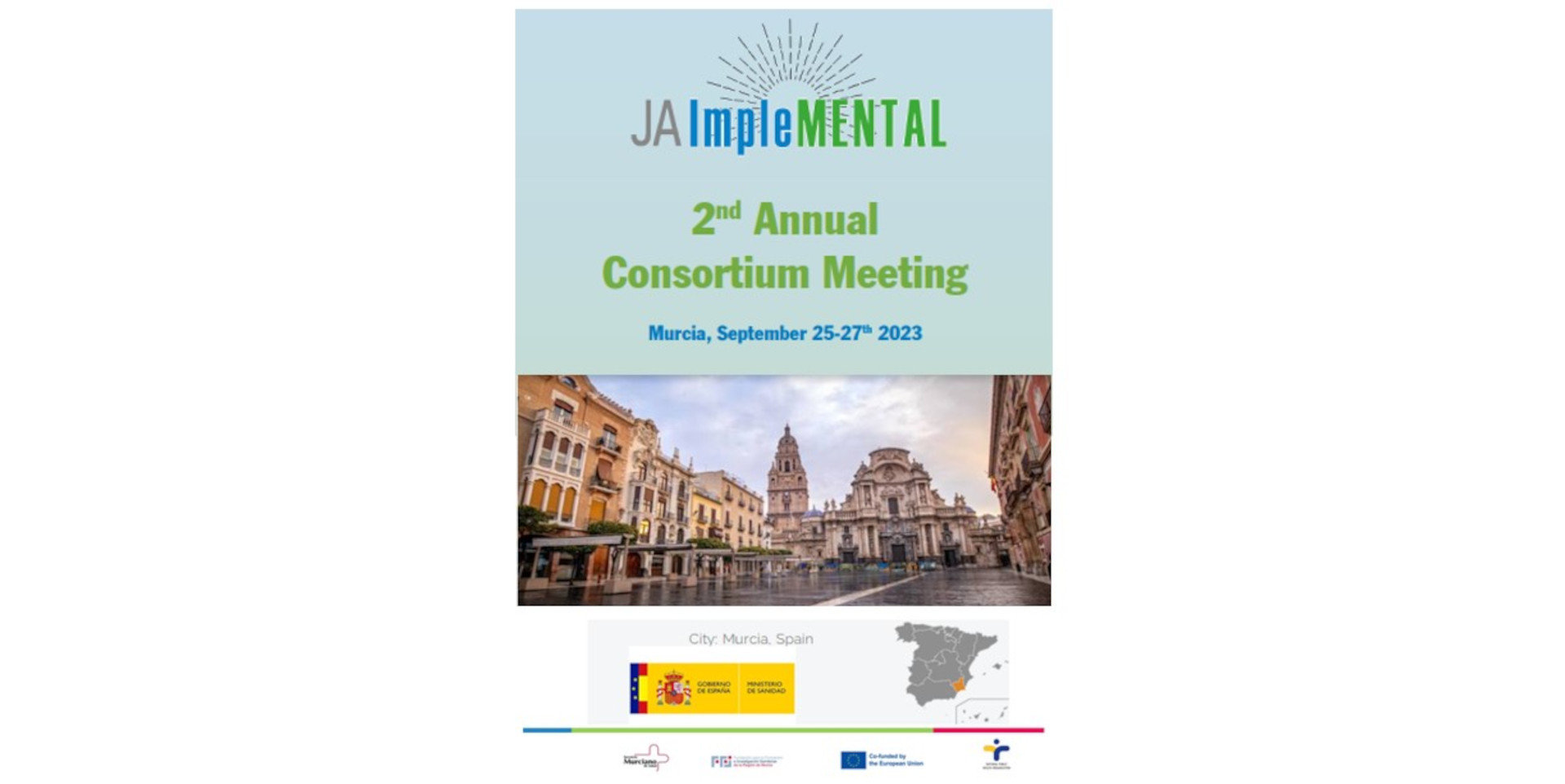 La Segunda Reunión Anual del Consorcio y las reuniones coincidentes del Foro de Partes Interesadas , Asamblea General y Comité de Políticas de los Estados Miembros de la Acción Conjunta ImpleMENTAL (Implementación de Mejores Prácticas en el Área de Salud Mental) se llevarán a cabo este año en Murcia, España, del 25 al 27 de septiembre de 2023.