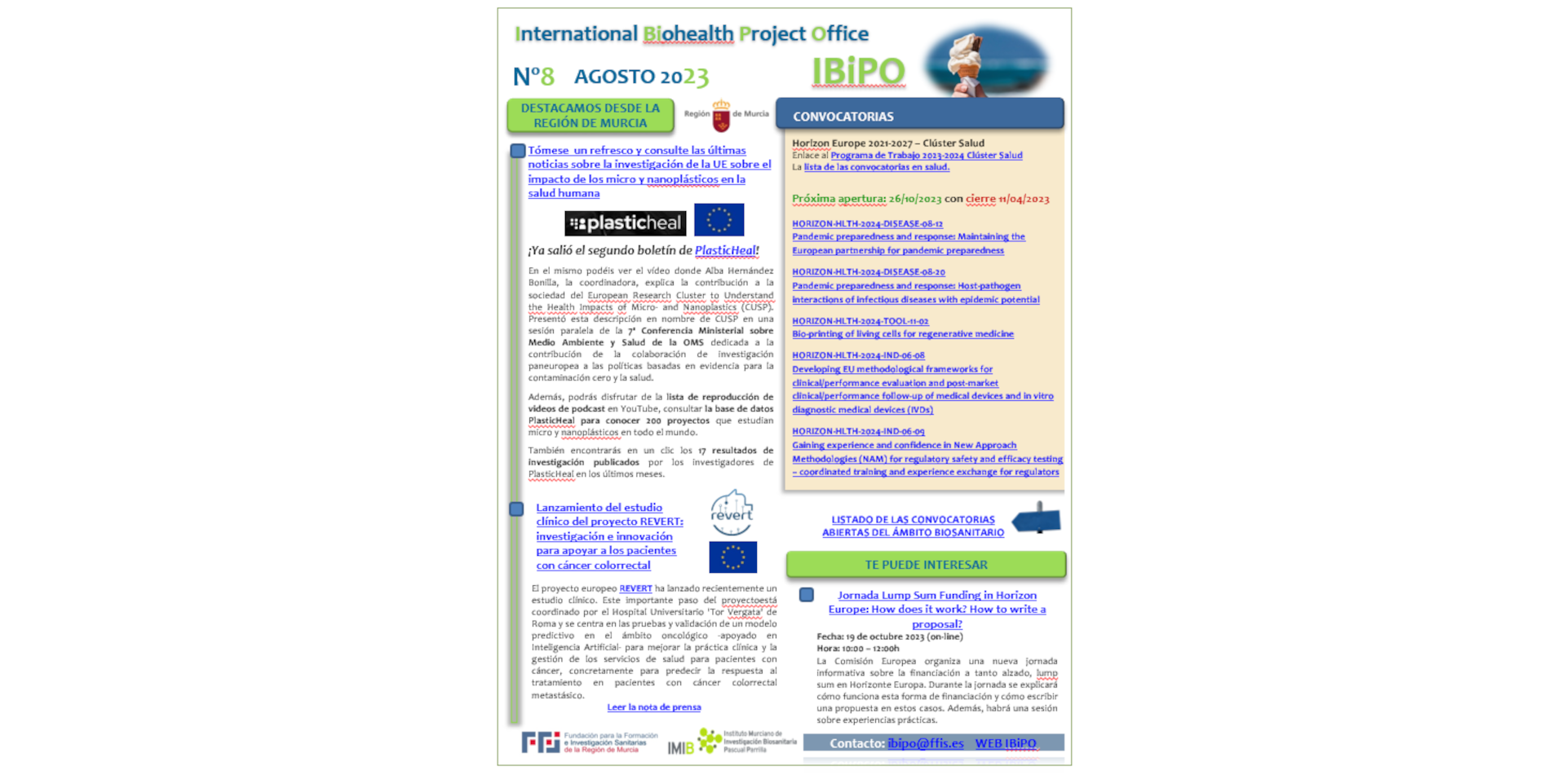 En el boletín informativo veraniego de la IBiPO del mes de agosto te invitamos a tomar un refresco mientras leas las últimas noticias sobre la investigación de la UE sobre el impacto de los micro y nanoplásticos en la salud humana. Destacamos así la contribución a la sociedad del European Research Cluster to Understand the Health Impacts of Micro- and Nanoplastics (CUSP), del cual forma parte el proyecto europeo PLASTICHEAL con la participación del equipo investigador del IMIB.